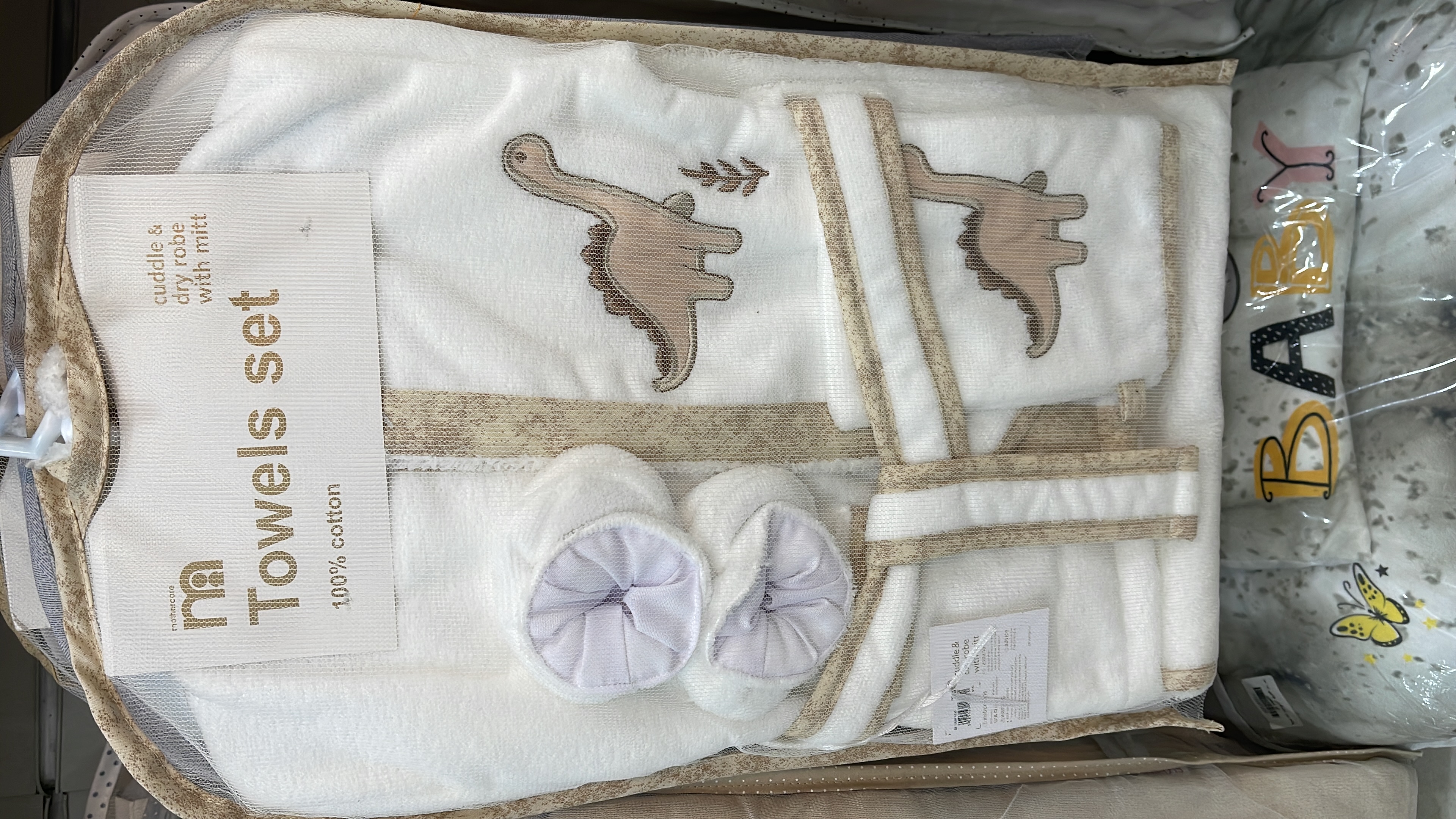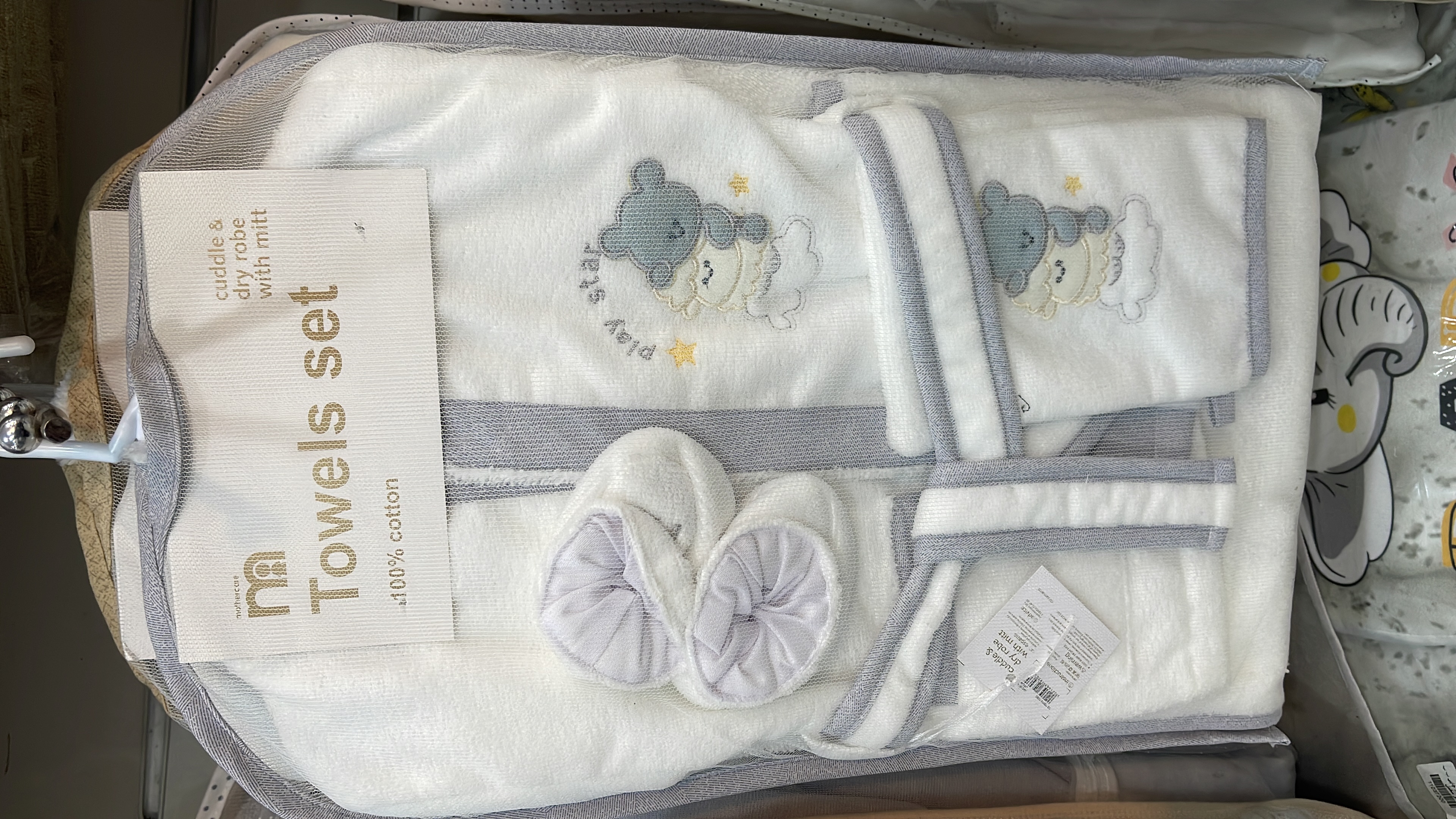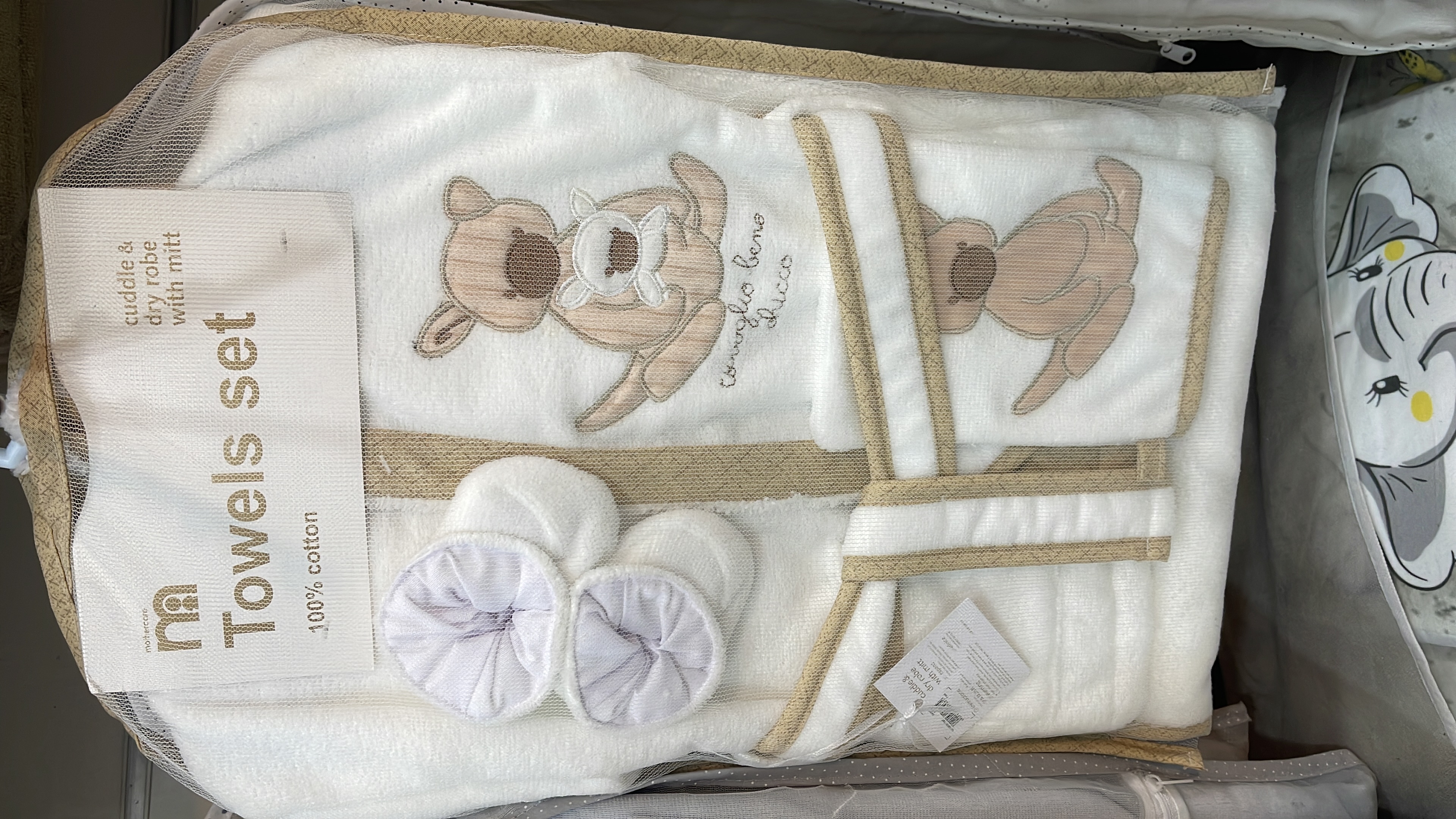 سرویس حوله نوزادی شامل حوله تن پوش مناسب تا سه سالگی و کمر بند حوله حوله کلاه دار مناسب تا یکسال حوله دستی لیف پاپوش